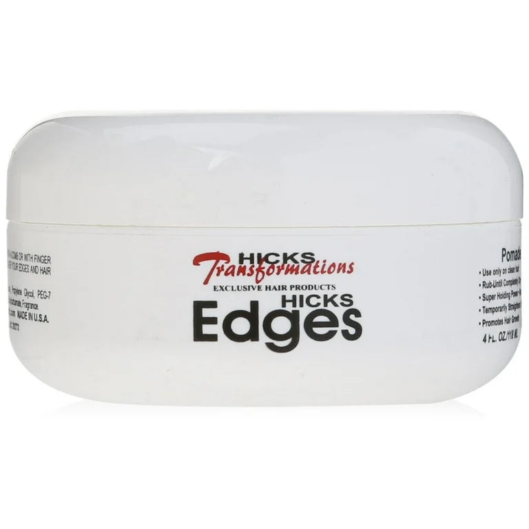 HICKS Total Transformations Edges Pomade growth and holds your edges and hair firmly in place with super holding power without flakiness leaves edges looking and feeling healthier and shinier than before. This genuine hair pomade is non-flakey and non-greasy. Controls tapered cuts and edges. Also can be used as a curling pomade with the thermal irons.