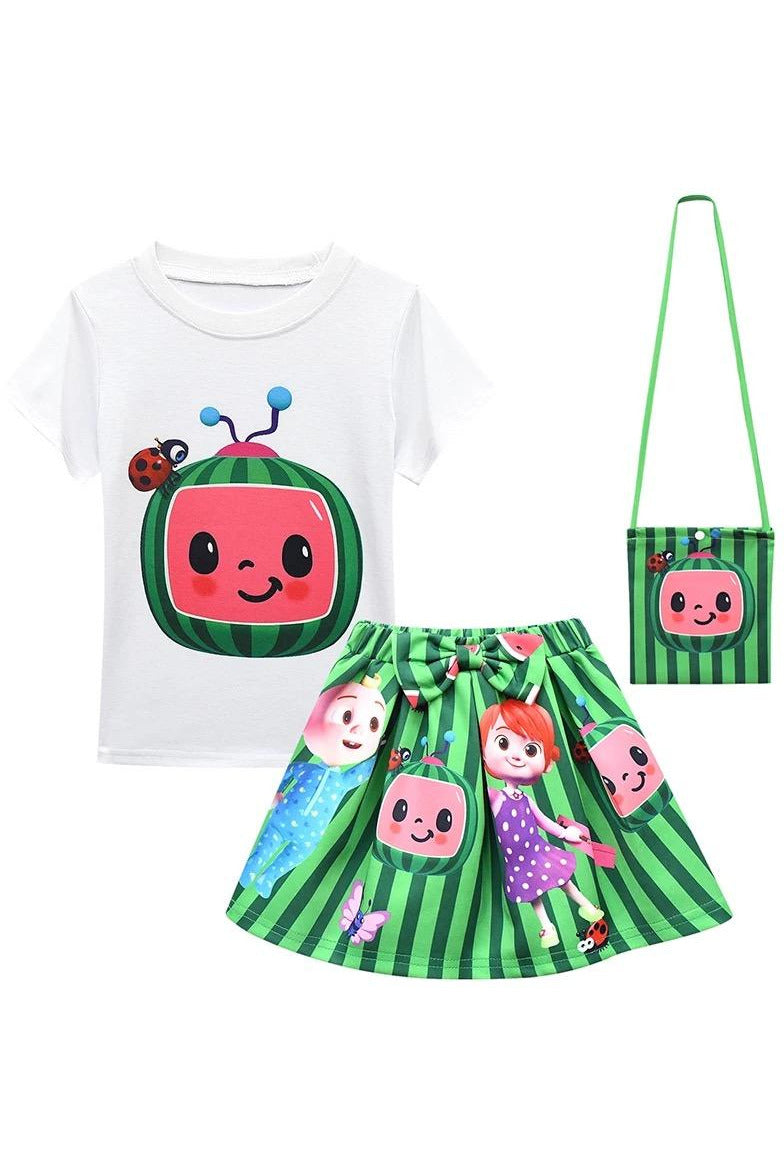 Coco melon graphic children boutique clothes 3 piece shirt skirt purse summer girls clothing sets.